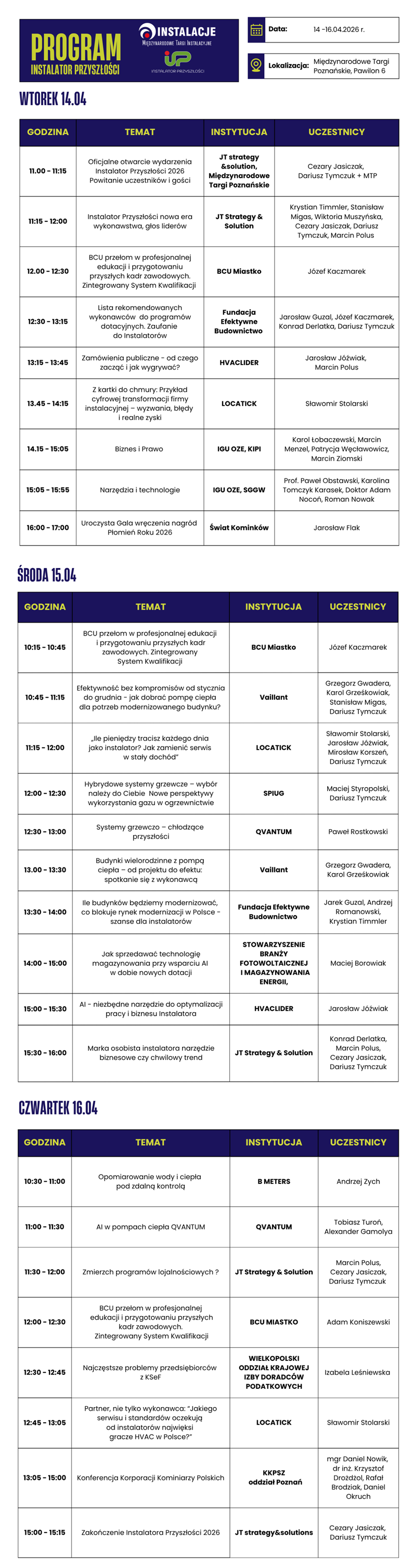Instalator Przyszłości 2026 to serce Targów INSTALACJE, które odbędą się w dniach 14-16 kwietnia 2026 r. na terenie Międzynarodowych Targów Poznańskich (Pawilon 6). Formuła wydarzenia rezygnuje z klasycznych stoisk na rzecz dynamicznych paneli dyskusyjnych prowadzonych na scenie głównej. Program został podzielony na siedem bloków tematycznych – od nowoczesnych technologii i sztucznej inteligencji, po finanse oraz prawo – co pozwala uczestnikom na zdobycie gotowych rozwiązań do wdrożenia we własnych firmach.